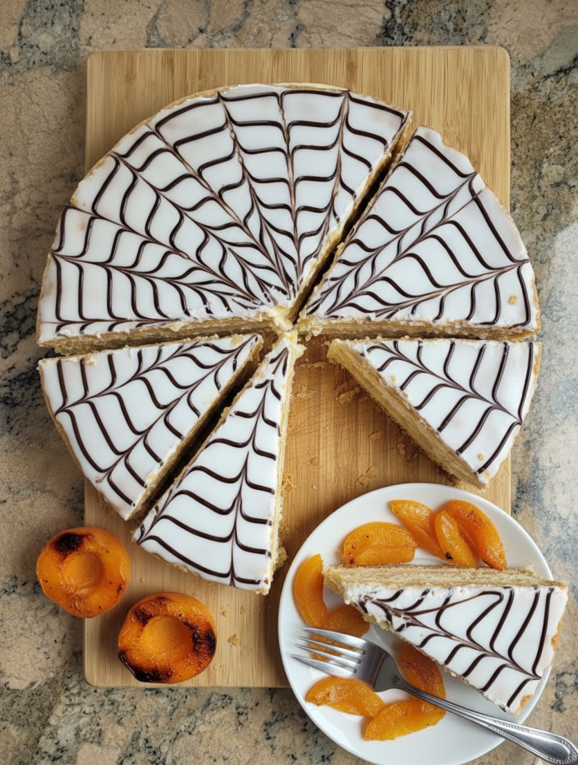 Lait, pate feuilletée, œufs, sucre, confiture d’abricot, abricots, fécule de maïs, sucre glace, chocolat et noir et vanille.